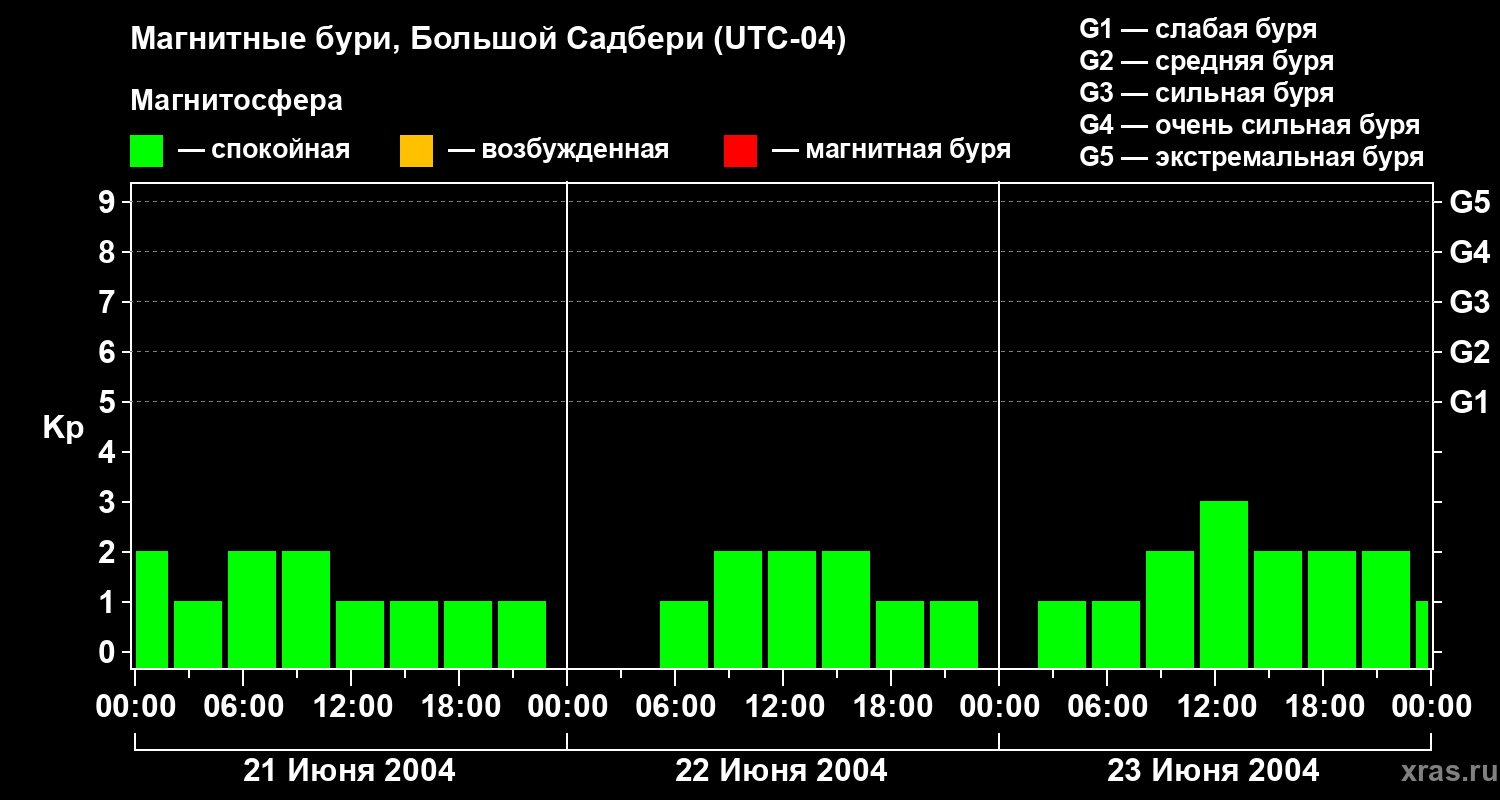 Изменения геомагнитного индекса Kp с 21 по 23 июня 2004 года для средних широт