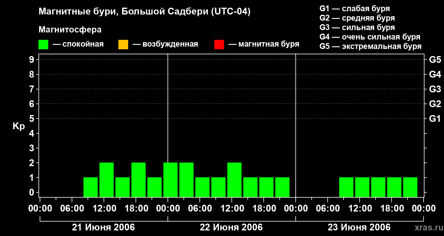 Изменения геомагнитного индекса Kp с 21 по 23 июня 2006 года для средних широт