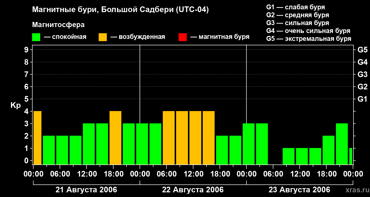Изменения геомагнитного индекса Kp с 21 по 23 августа 2006 года для средних широт