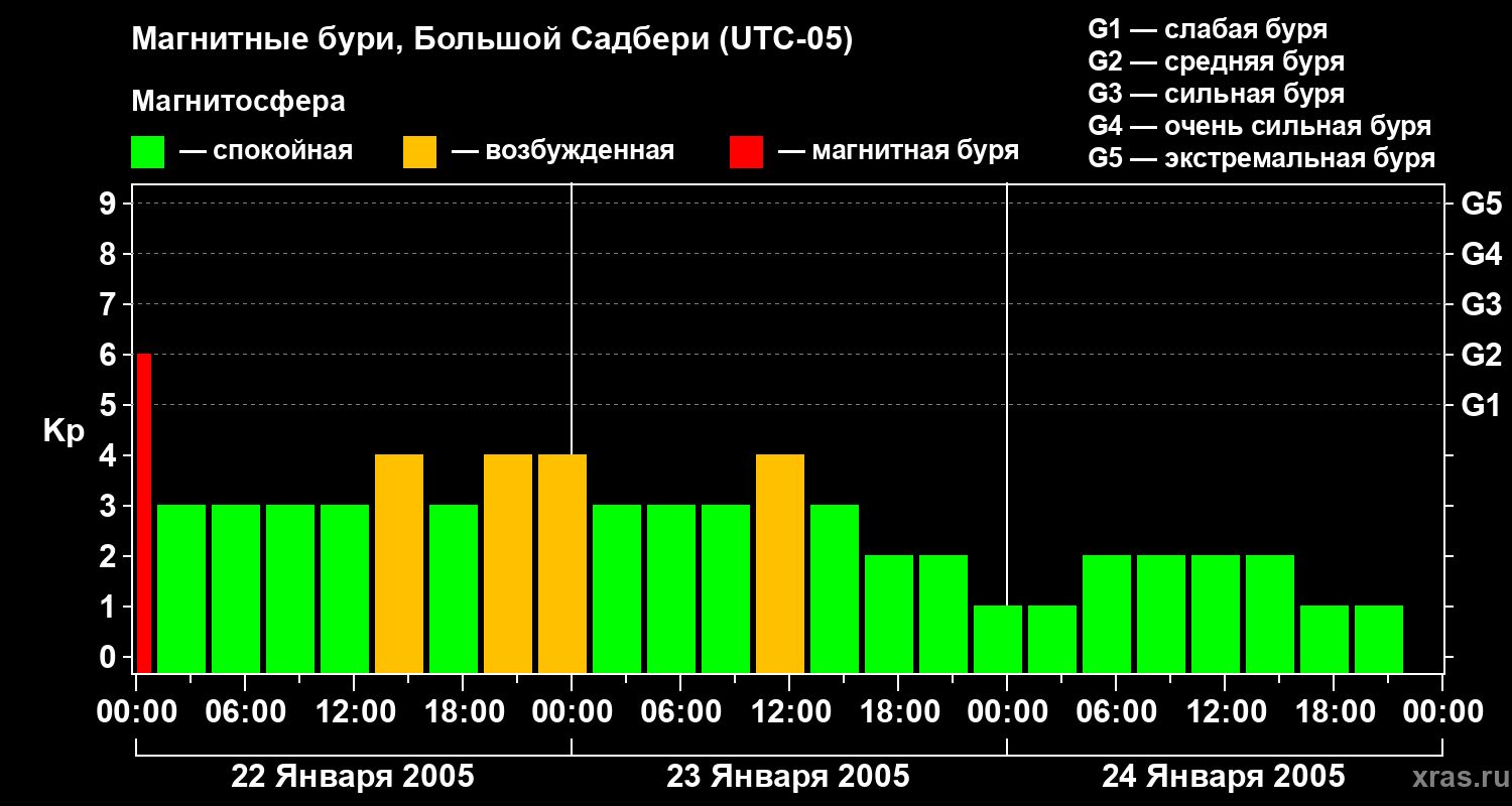 Изменения геомагнитного индекса Kp с 22 по 24 января 2005 года для средних широт