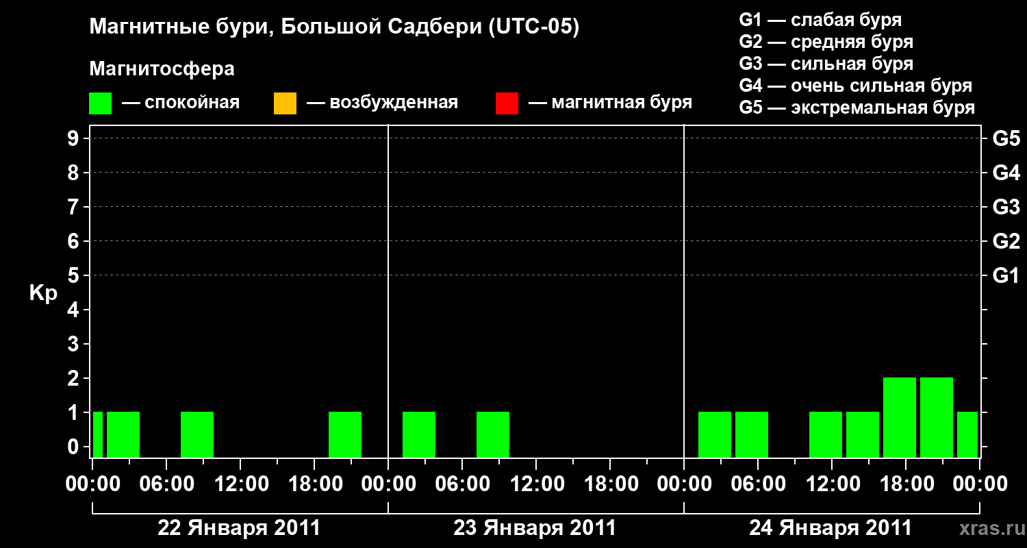 Изменения геомагнитного индекса Kp с 22 по 24 января 2011 года для средних широт