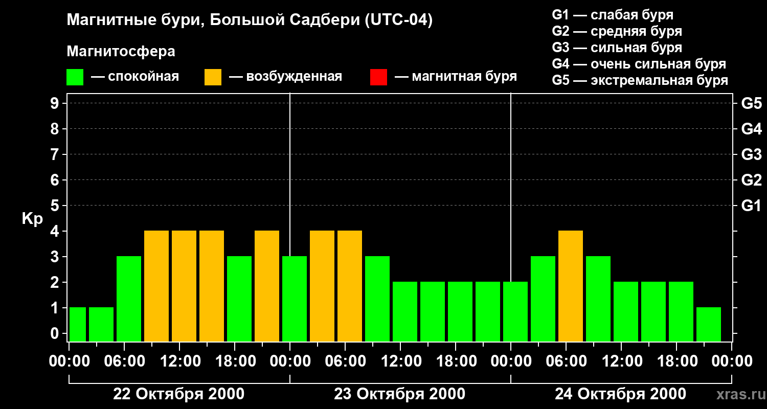 Изменения геомагнитного индекса Kp с 22 по 24 октября 2000 года для средних широт