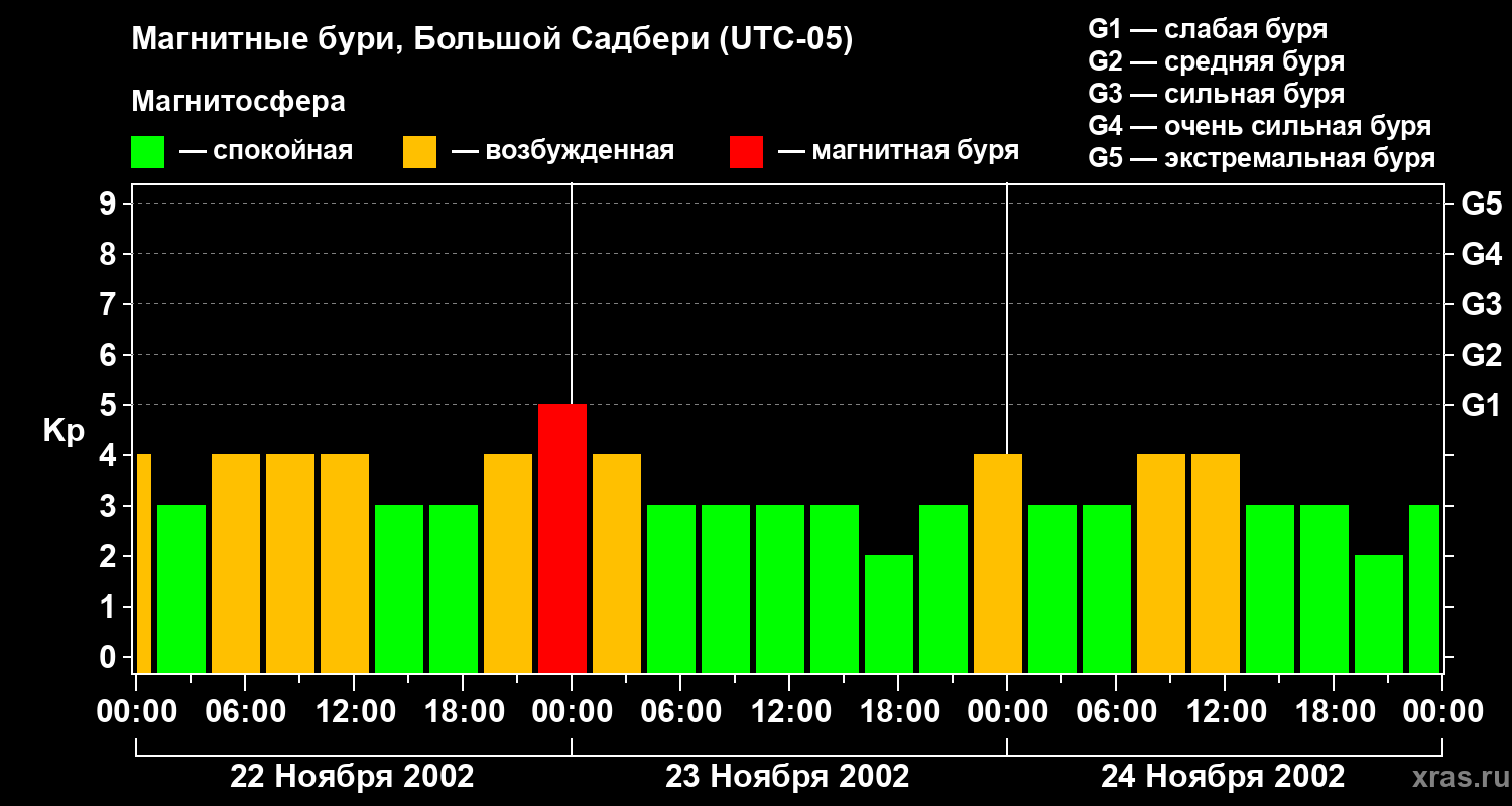 Изменения геомагнитного индекса Kp с 22 по 24 ноября 2002 года для средних широт