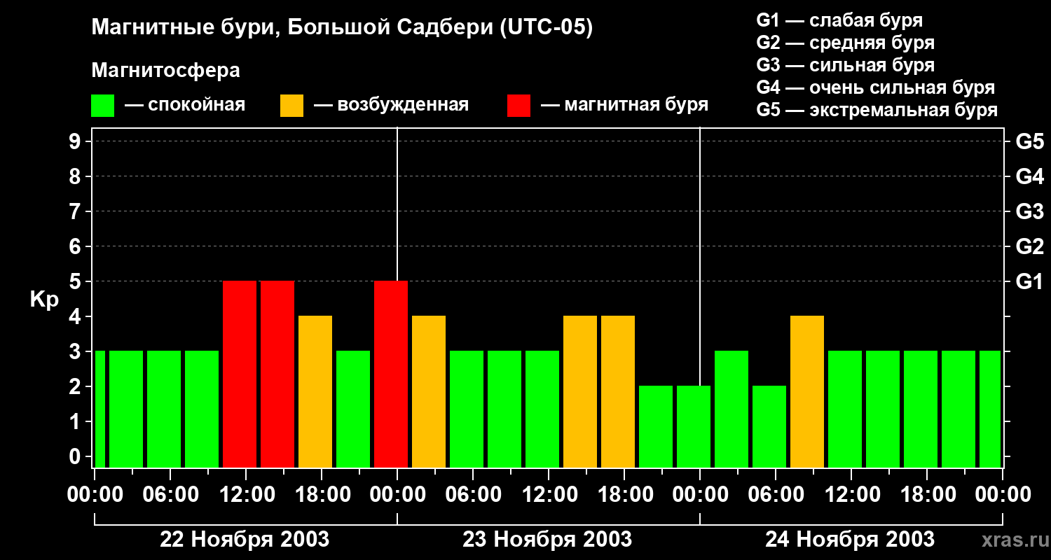 Изменения геомагнитного индекса Kp с 22 по 24 ноября 2003 года для средних широт