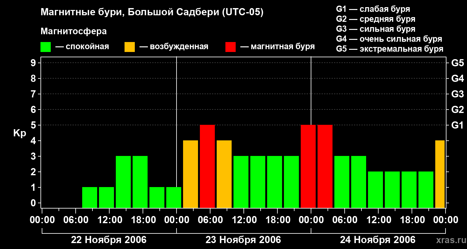 Изменения геомагнитного индекса Kp с 22 по 24 ноября 2006 года для средних широт