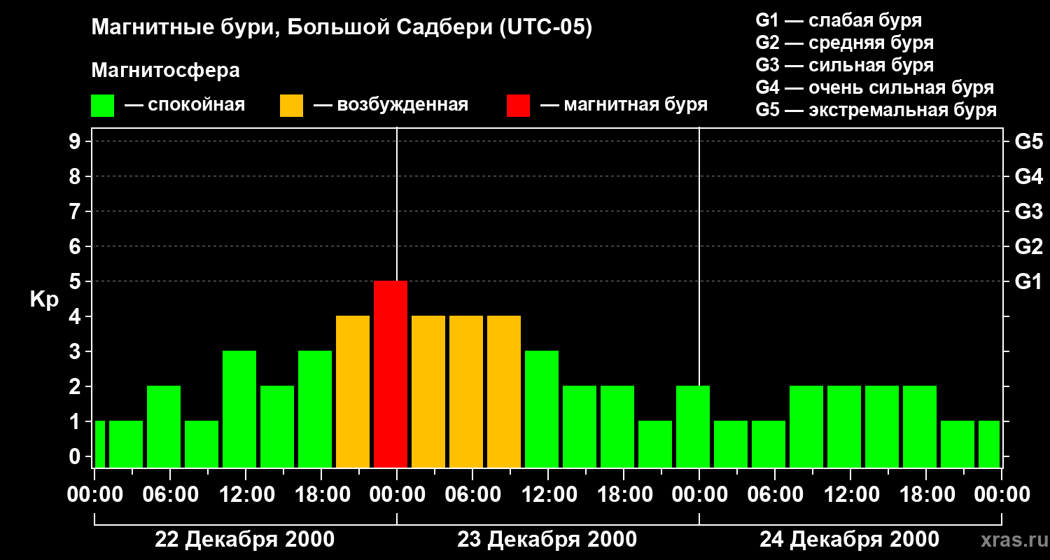 Изменения геомагнитного индекса Kp с 22 по 24 декабря 2000 года для средних широт