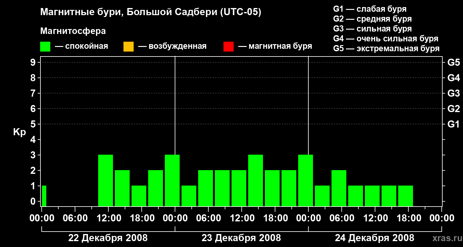 Изменения геомагнитного индекса Kp с 22 по 24 декабря 2008 года для средних широт