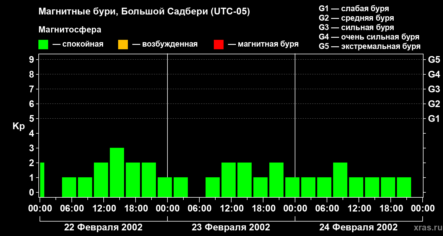 Изменения геомагнитного индекса Kp с 22 по 24 февраля 2002 года для средних широт