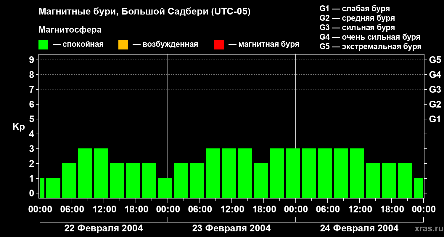 Изменения геомагнитного индекса Kp с 22 по 24 февраля 2004 года для средних широт