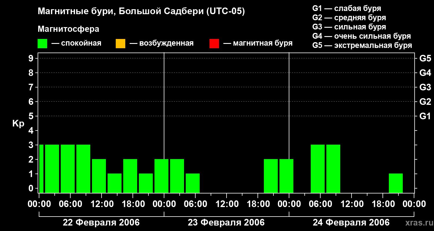 Изменения геомагнитного индекса Kp с 22 по 24 февраля 2006 года для средних широт