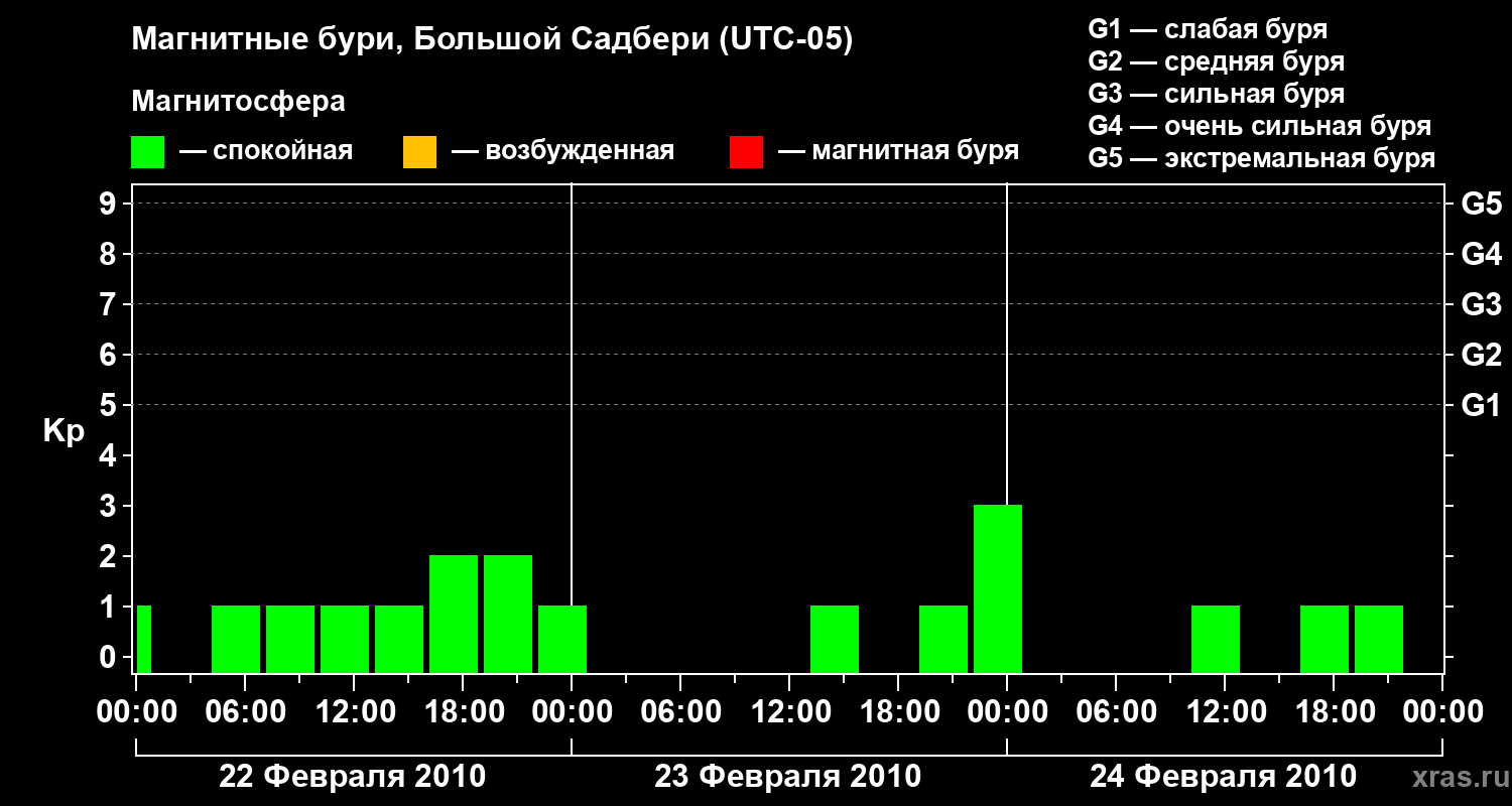 Изменения геомагнитного индекса Kp с 22 по 24 февраля 2010 года для средних широт