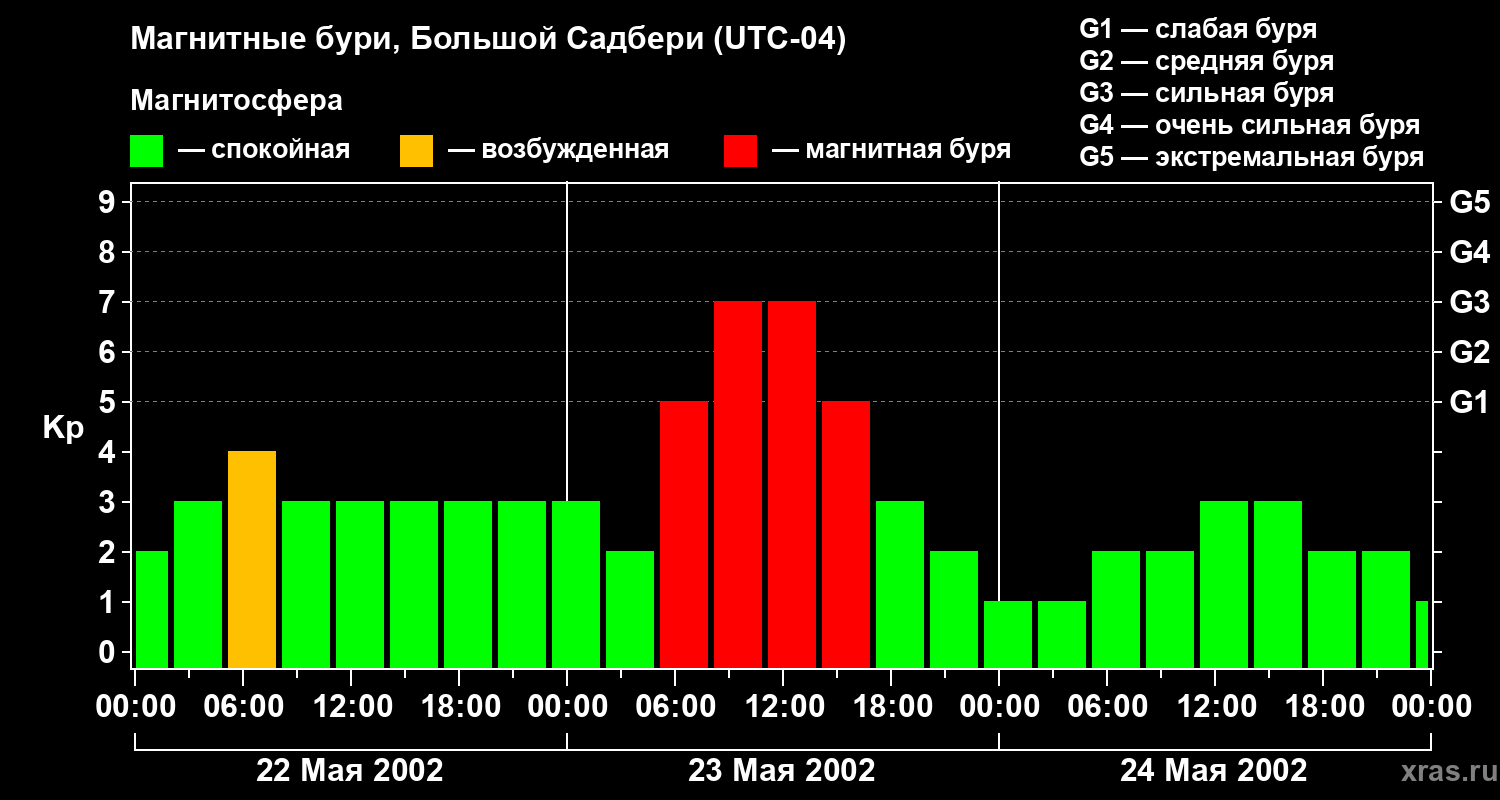 Изменения геомагнитного индекса Kp с 22 по 24 мая 2002 года для средних широт