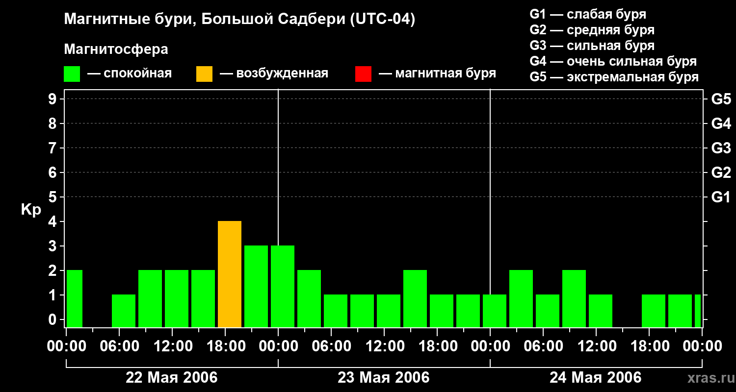 Изменения геомагнитного индекса Kp с 22 по 24 мая 2006 года для средних широт