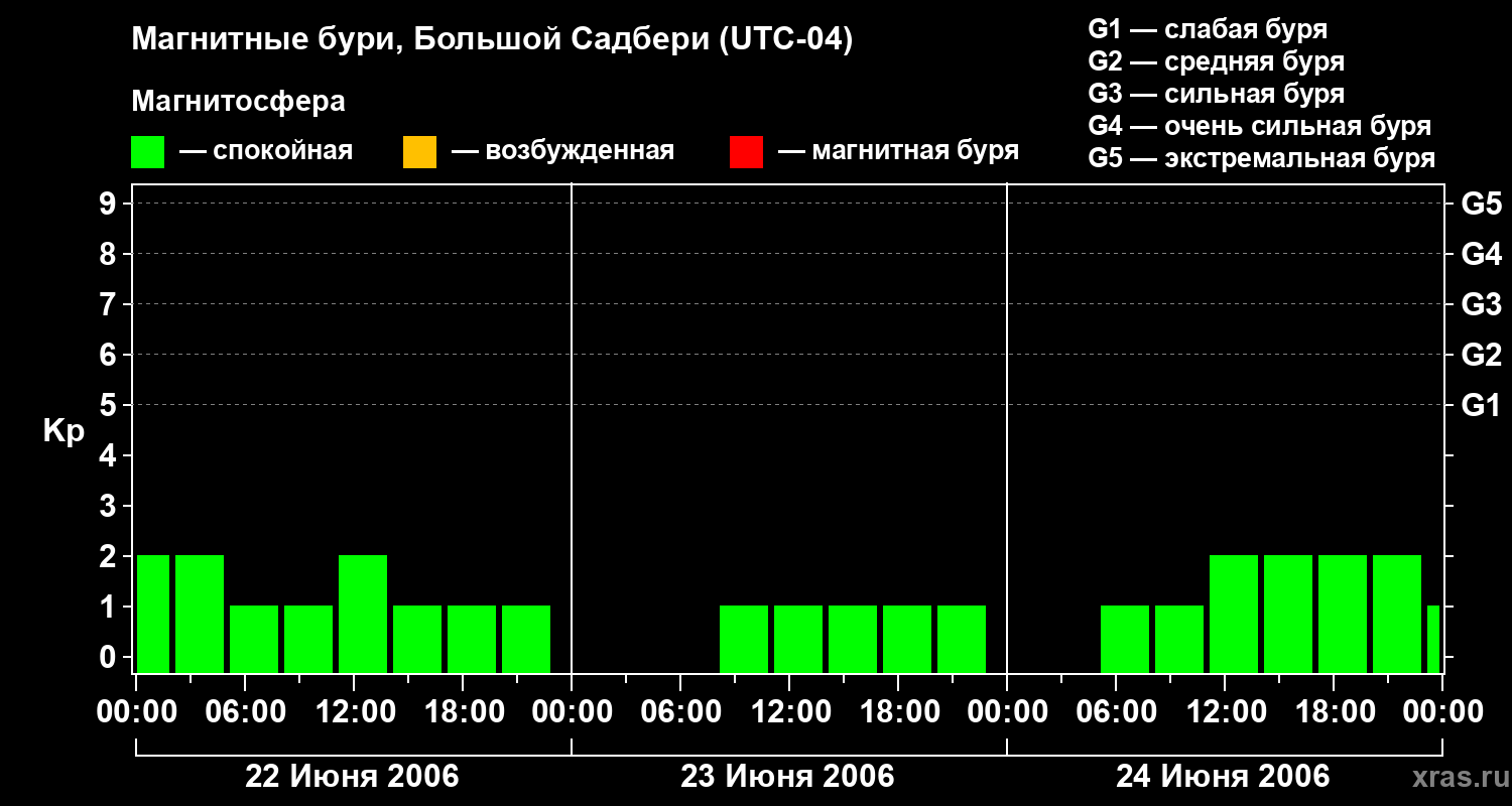 Изменения геомагнитного индекса Kp с 22 по 24 июня 2006 года для средних широт