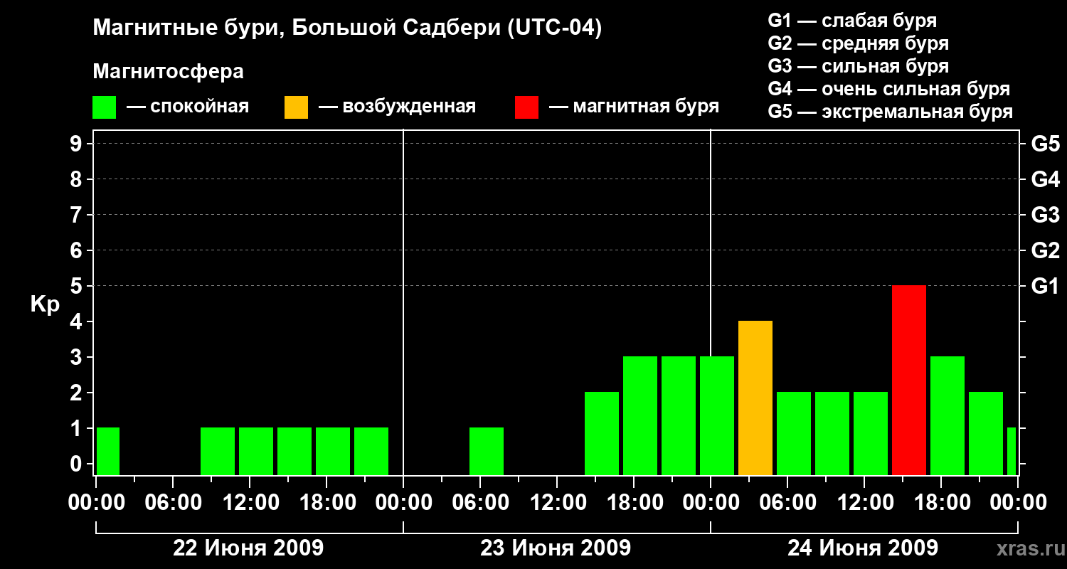 Изменения геомагнитного индекса Kp с 22 по 24 июня 2009 года для средних широт