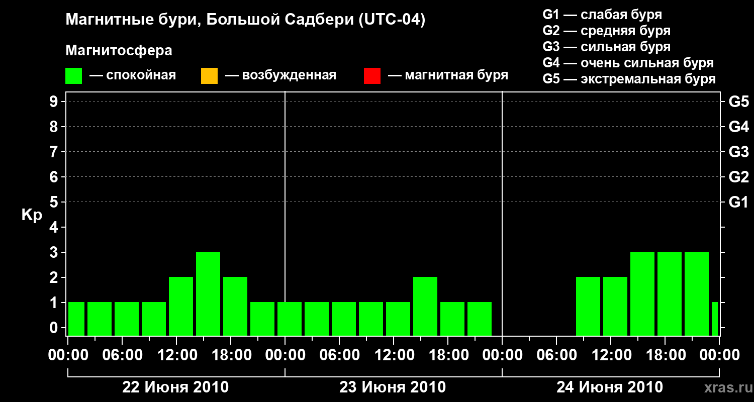 Изменения геомагнитного индекса Kp с 22 по 24 июня 2010 года для средних широт
