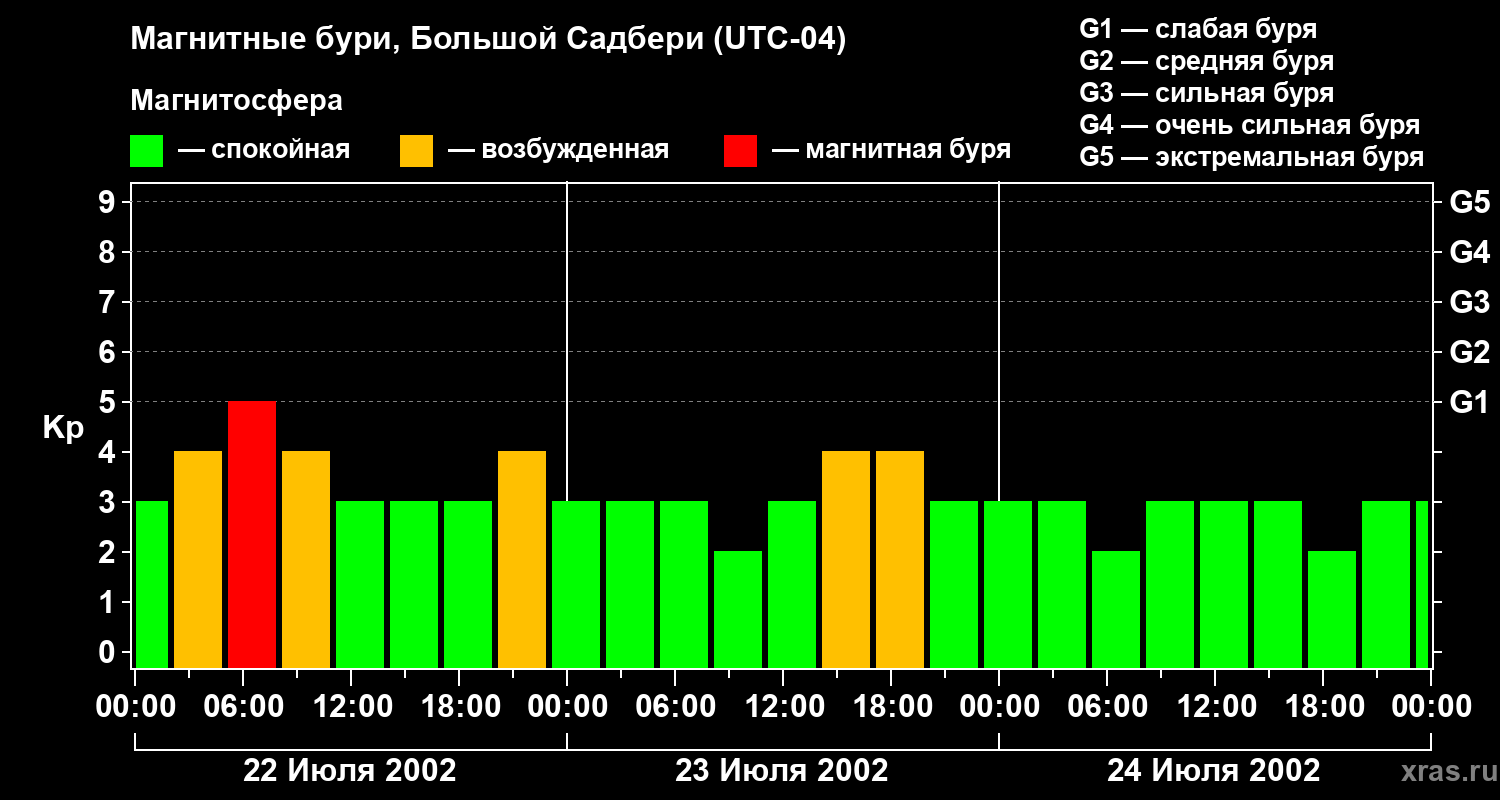 Изменения геомагнитного индекса Kp с 22 по 24 июля 2002 года для средних широт