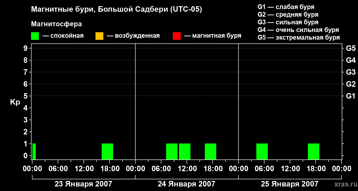Изменения геомагнитного индекса Kp с 23 по 25 января 2007 года для средних широт