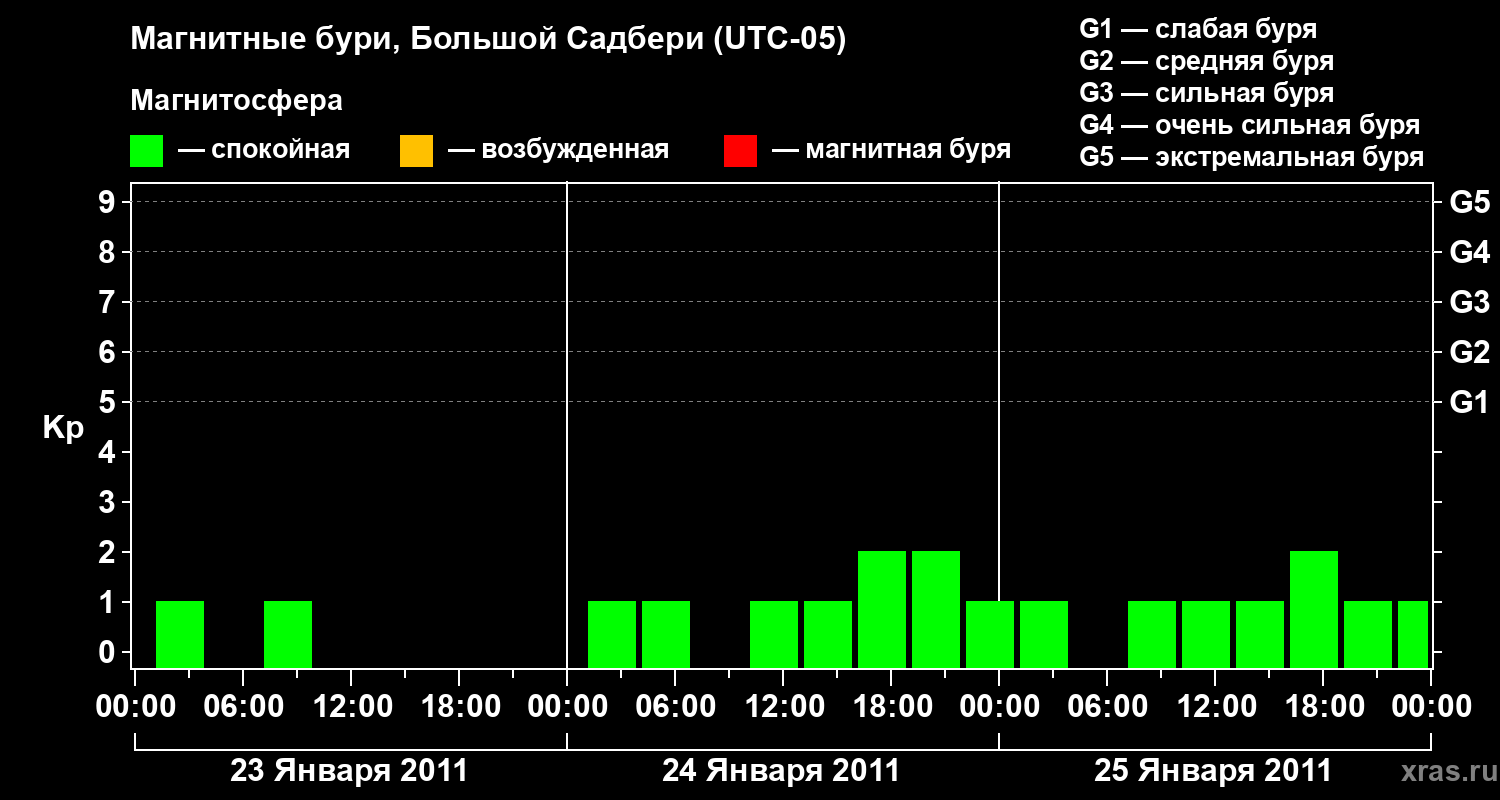 Изменения геомагнитного индекса Kp с 23 по 25 января 2011 года для средних широт