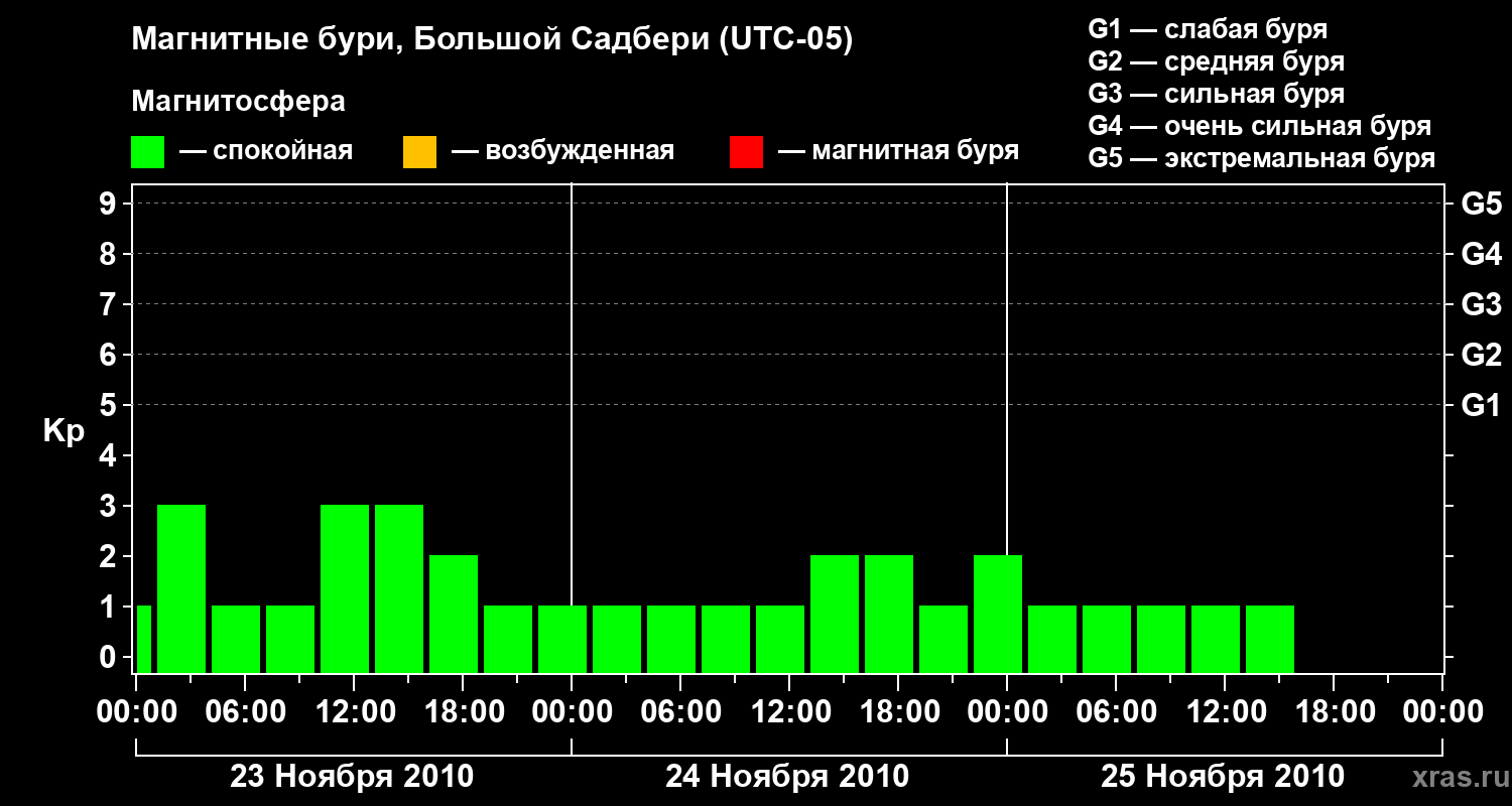 Изменения геомагнитного индекса Kp с 23 по 25 ноября 2010 года для средних широт
