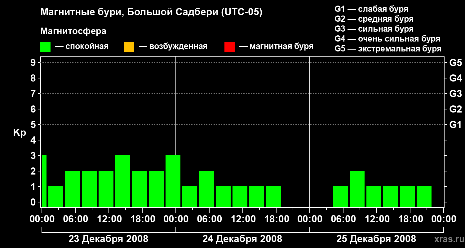 Изменения геомагнитного индекса Kp с 23 по 25 декабря 2008 года для средних широт