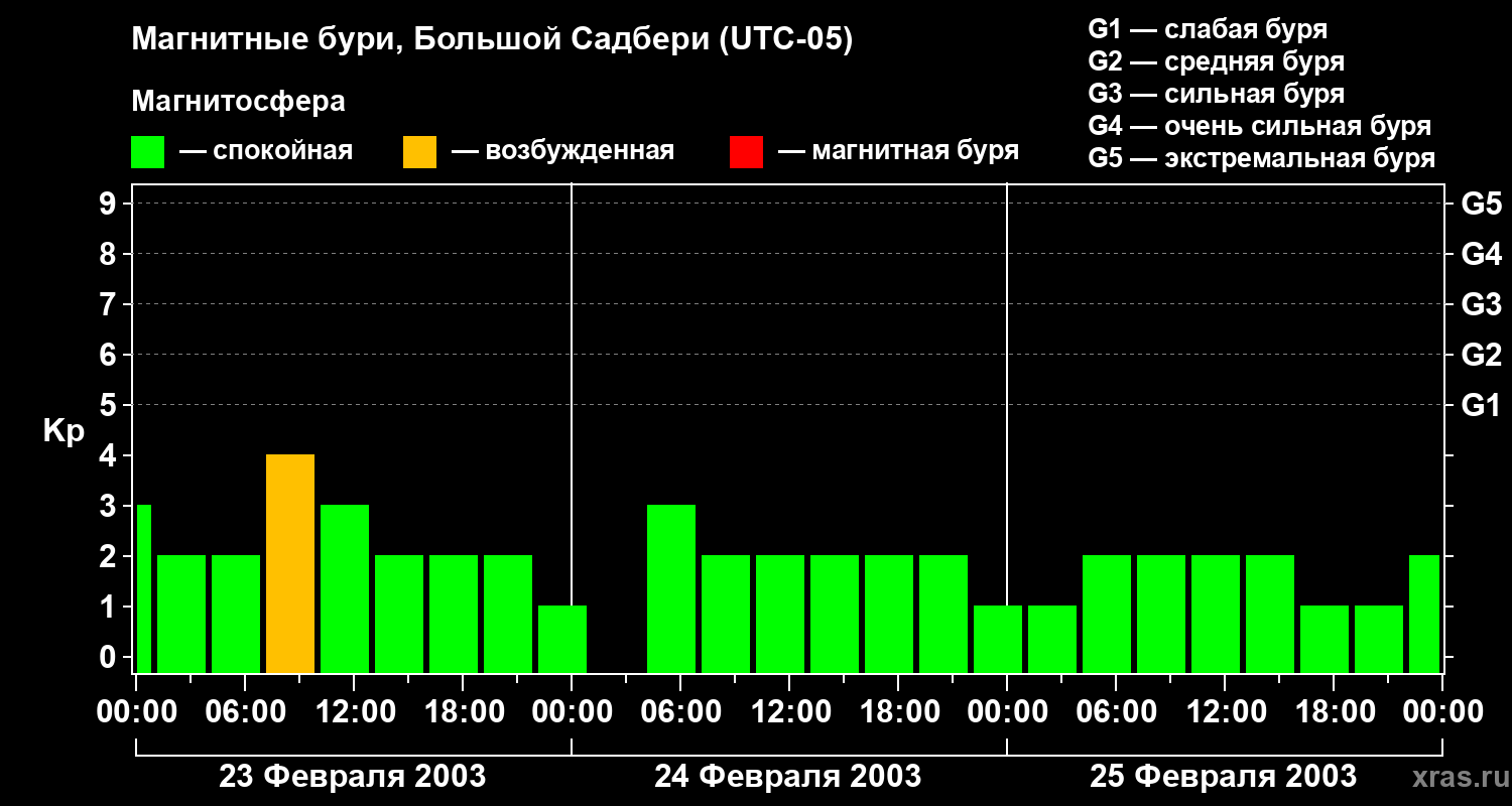 Изменения геомагнитного индекса Kp с 23 по 25 февраля 2003 года для средних широт