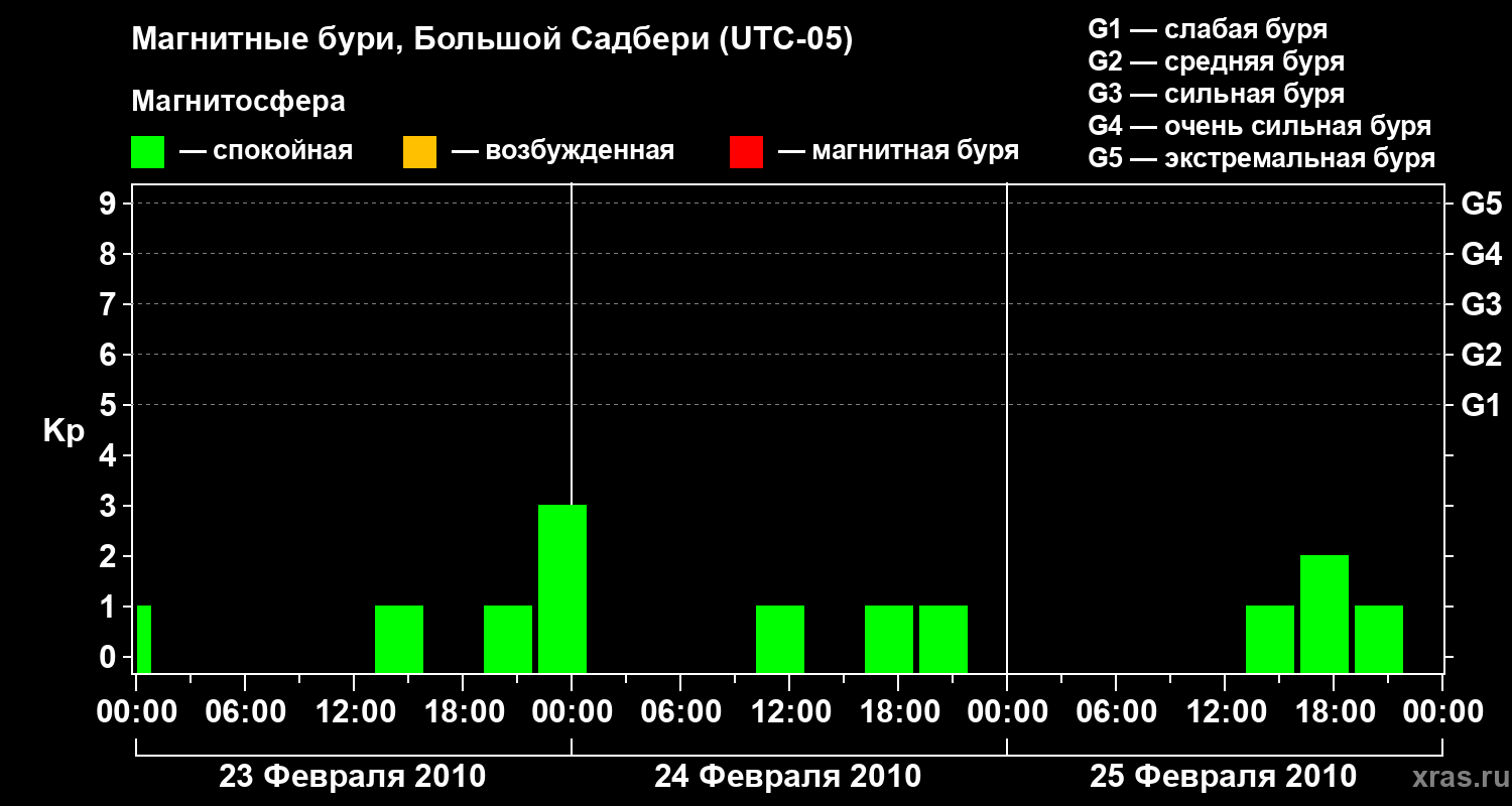 Изменения геомагнитного индекса Kp с 23 по 25 февраля 2010 года для средних широт
