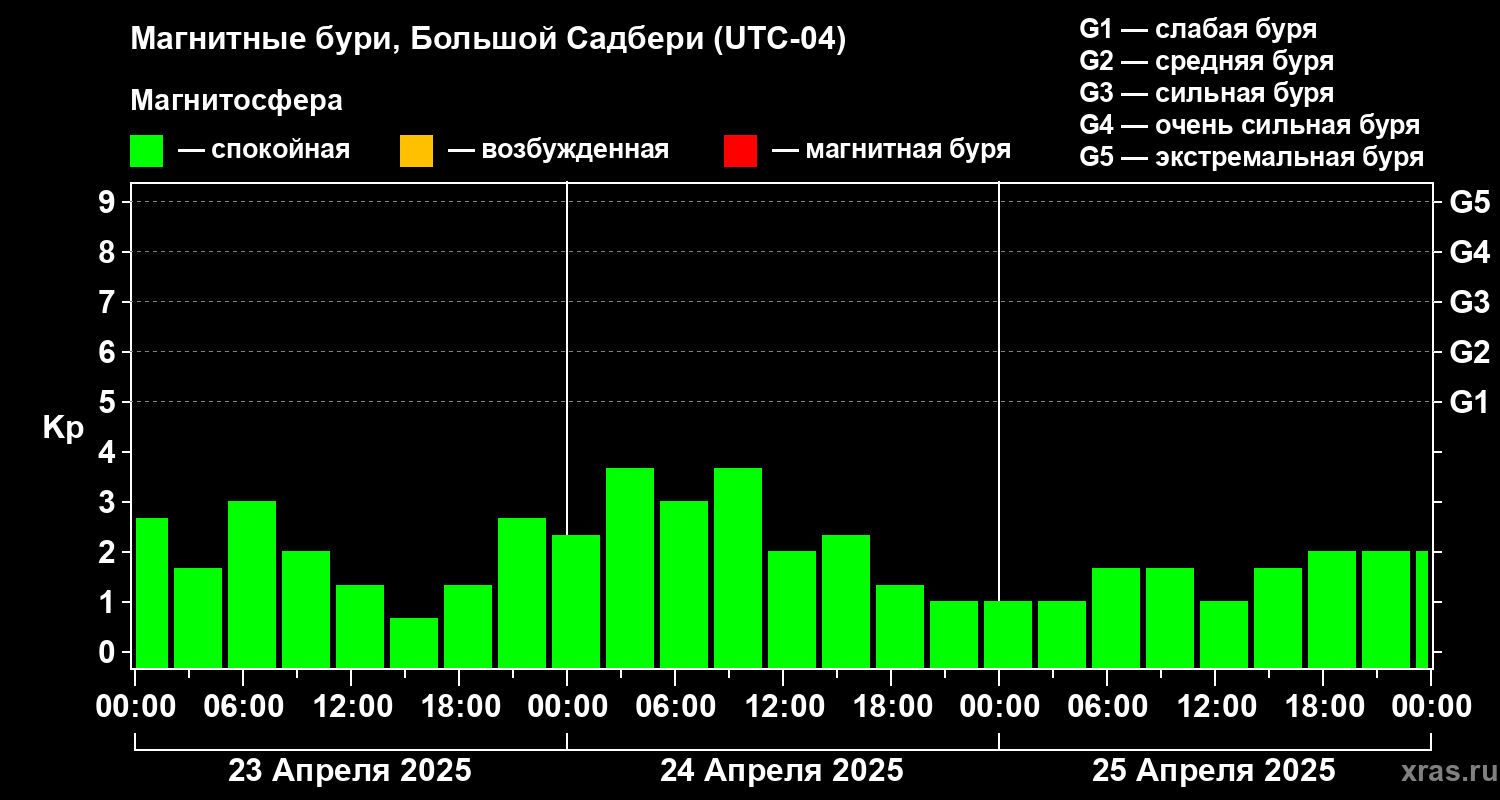 Изменения геомагнитного индекса Kp с 23 по 25 апреля 2025 года для средних широт