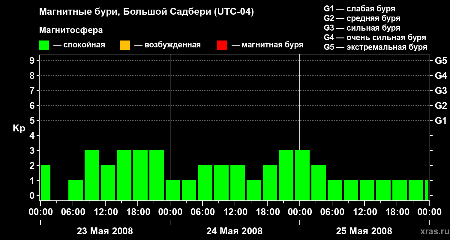 Изменения геомагнитного индекса Kp с 23 по 25 мая 2008 года для средних широт