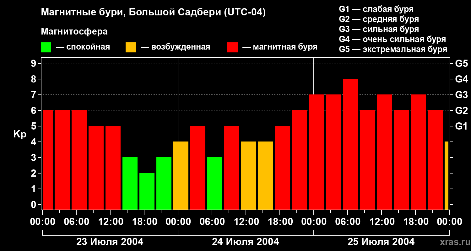 Изменения геомагнитного индекса Kp с 23 по 25 июля 2004 года для средних широт