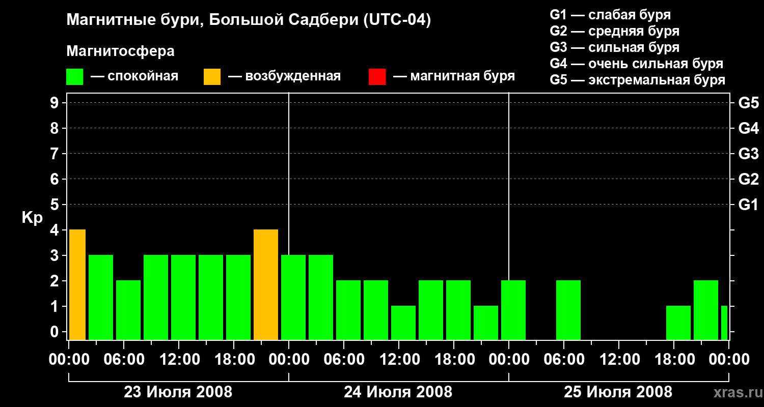 Изменения геомагнитного индекса Kp с 23 по 25 июля 2008 года для средних широт