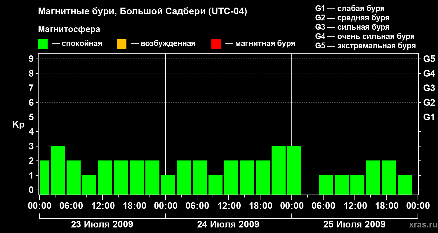 Изменения геомагнитного индекса Kp с 23 по 25 июля 2009 года для средних широт