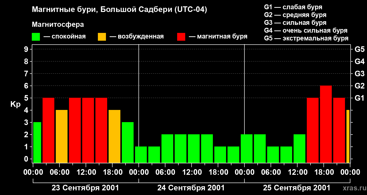 Изменения геомагнитного индекса Kp с 23 по 25 сентября 2001 года для средних широт