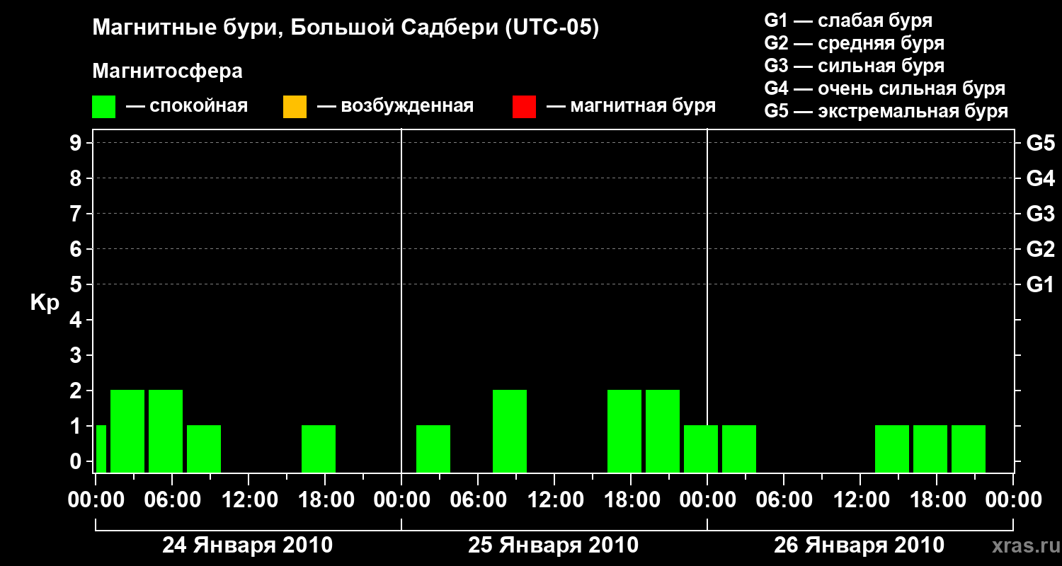 Изменения геомагнитного индекса Kp с 24 по 26 января 2010 года для средних широт