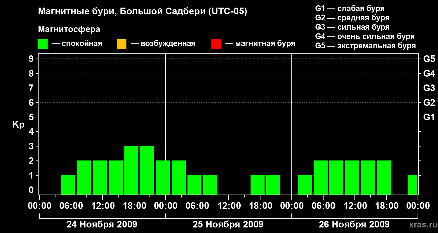 Изменения геомагнитного индекса Kp с 24 по 26 ноября 2009 года для средних широт