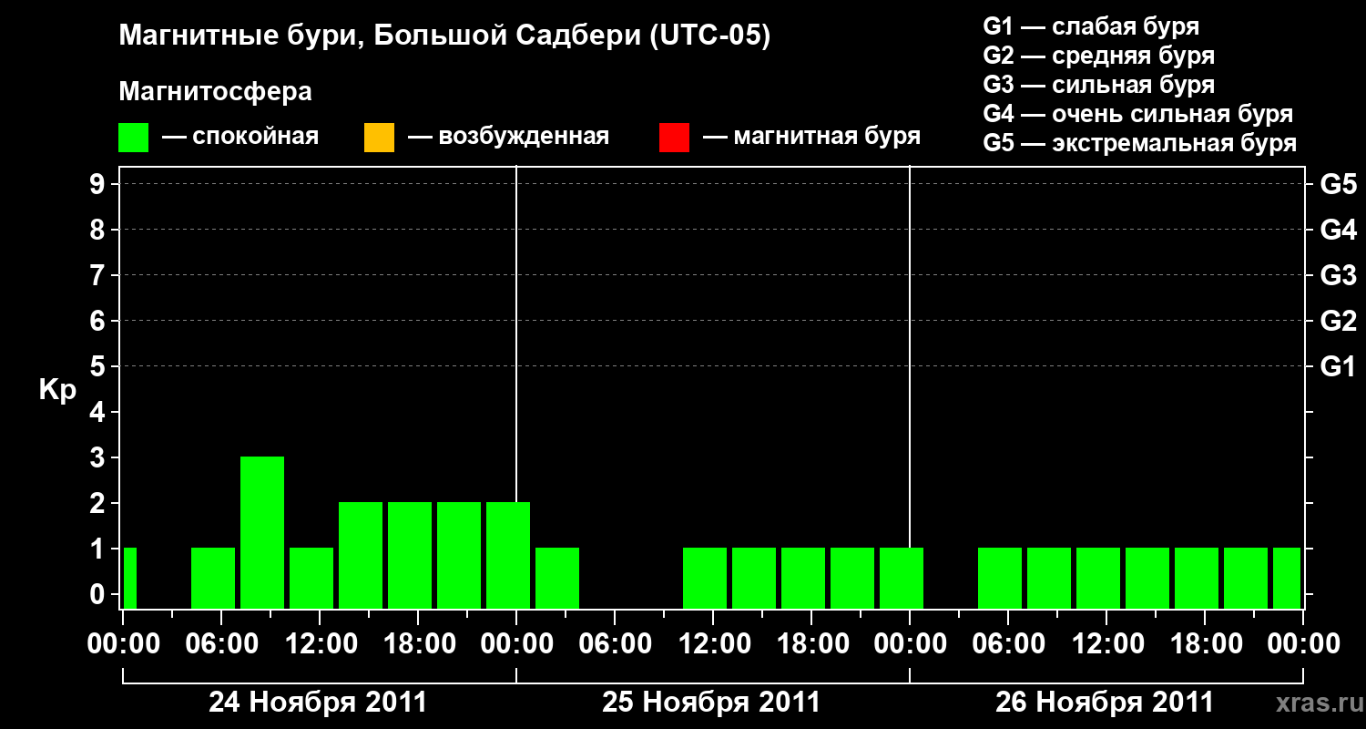 Изменения геомагнитного индекса Kp с 24 по 26 ноября 2011 года для средних широт