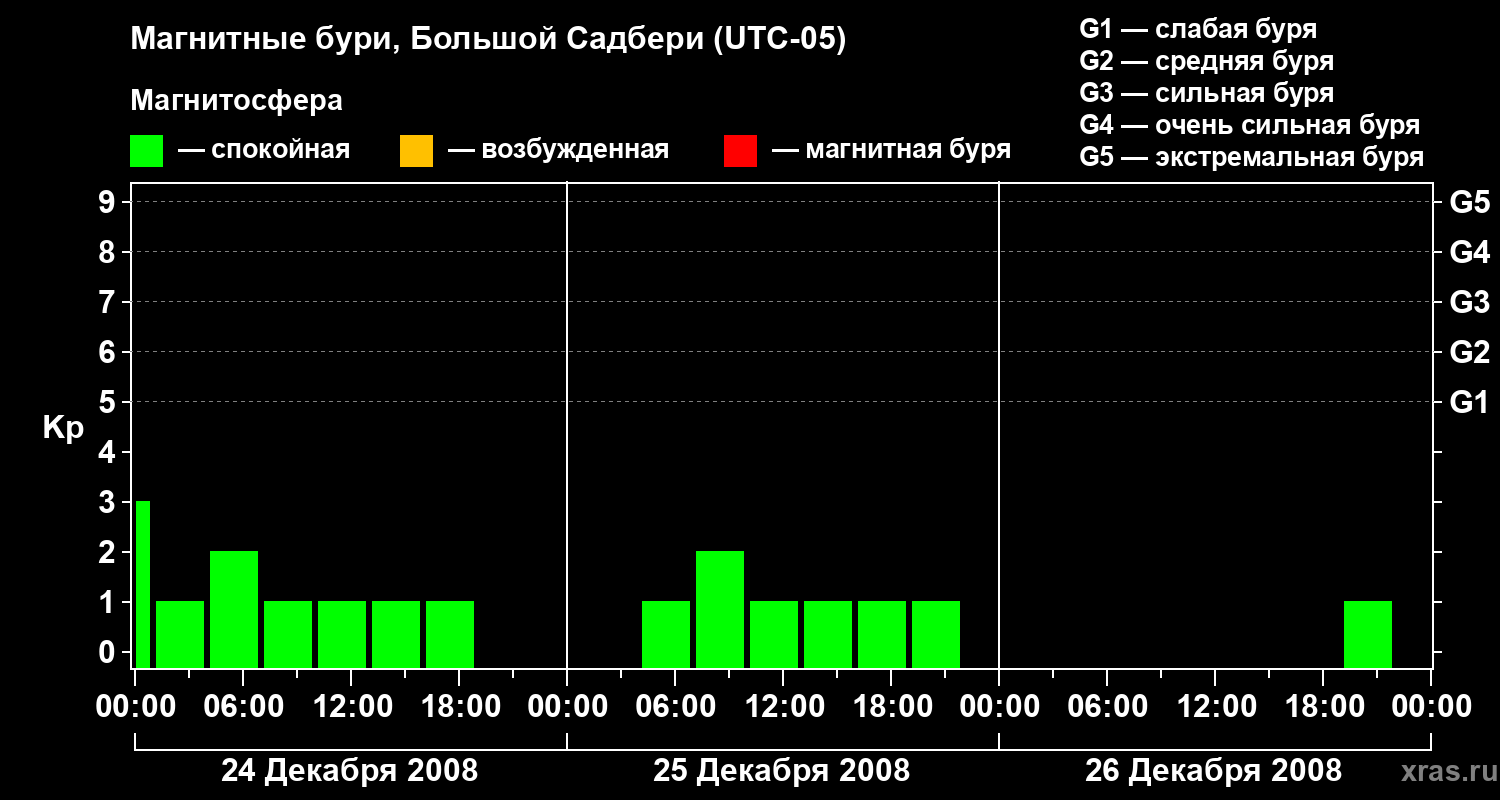 Изменения геомагнитного индекса Kp с 24 по 26 декабря 2008 года для средних широт
