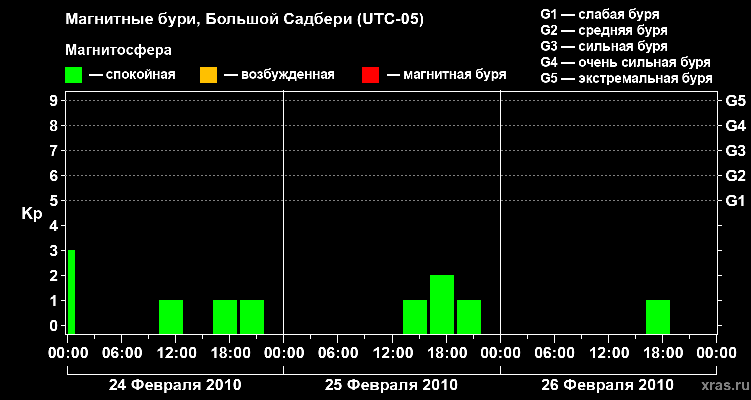 Изменения геомагнитного индекса Kp с 24 по 26 февраля 2010 года для средних широт
