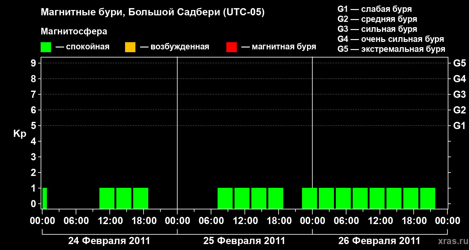 Изменения геомагнитного индекса Kp с 24 по 26 февраля 2011 года для средних широт