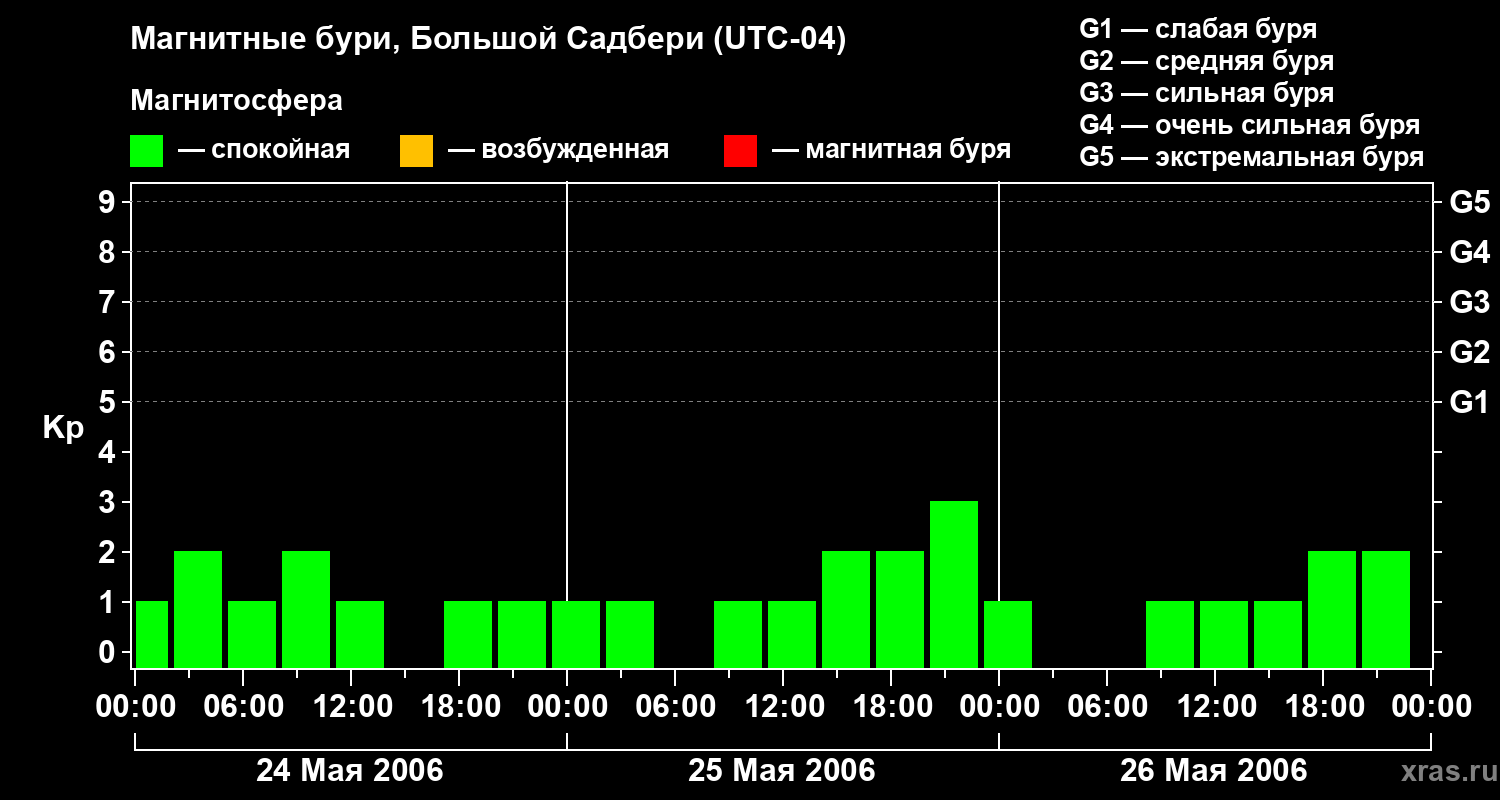 Изменения геомагнитного индекса Kp с 24 по 26 мая 2006 года для средних широт