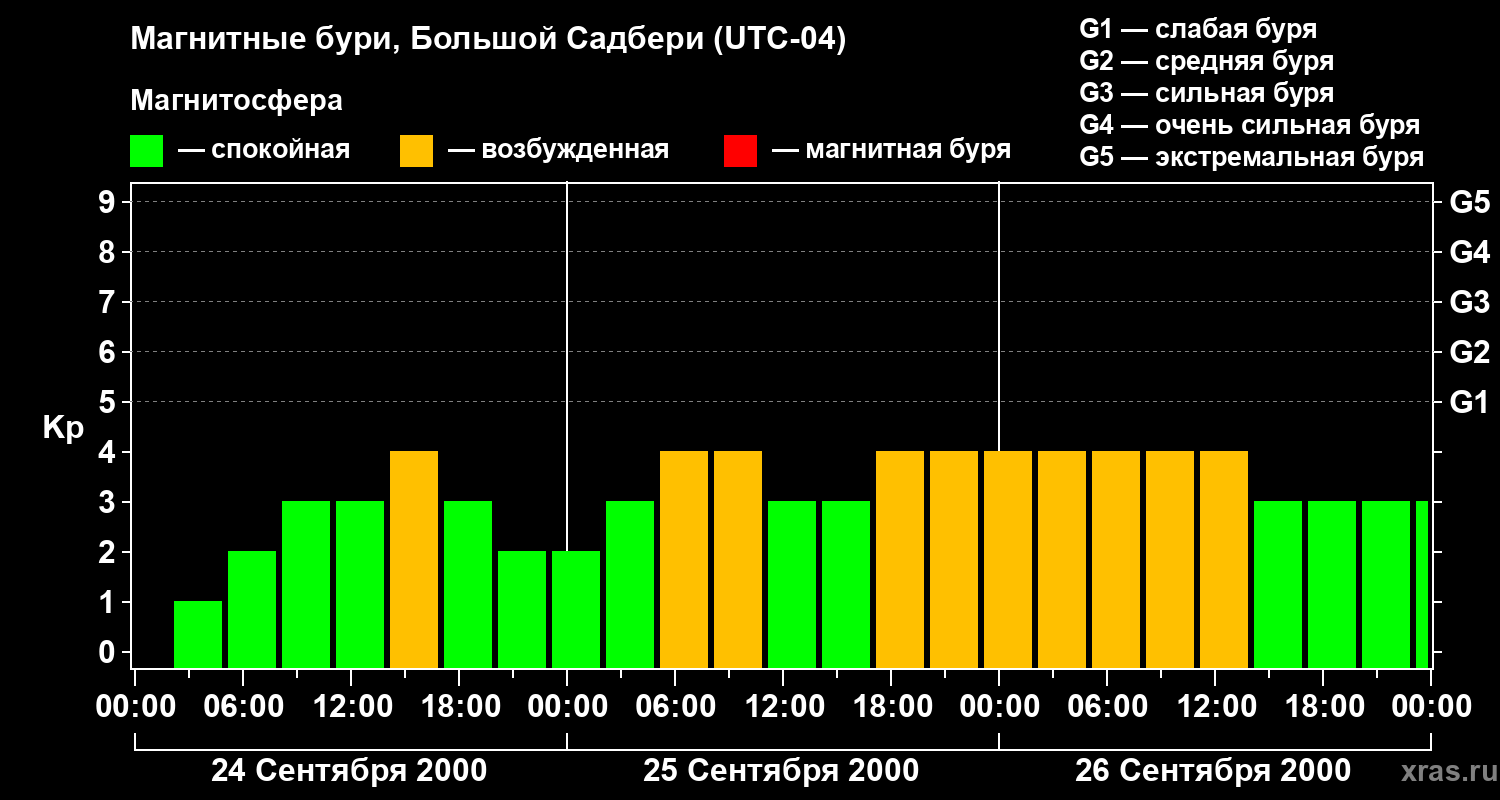 Изменения геомагнитного индекса Kp с 24 по 26 сентября 2000 года для средних широт