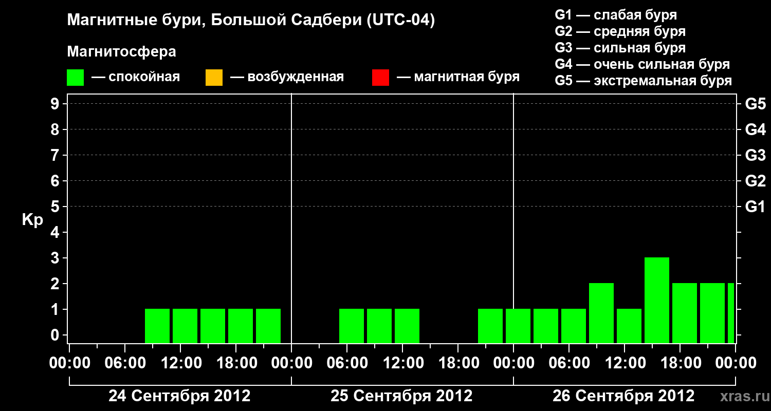 Изменения геомагнитного индекса Kp с 24 по 26 сентября 2012 года для средних широт
