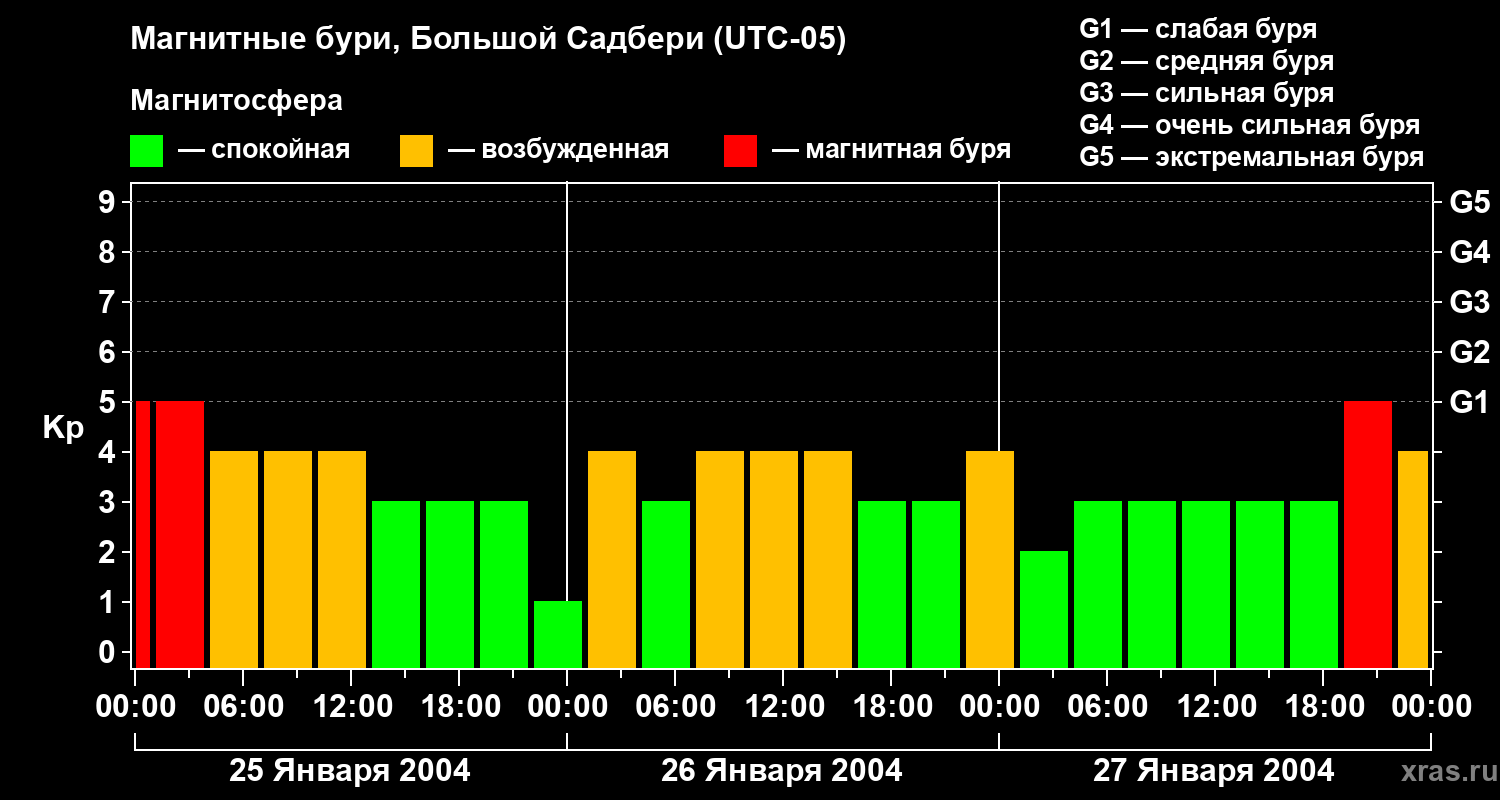 Изменения геомагнитного индекса Kp с 25 по 27 января 2004 года для средних широт