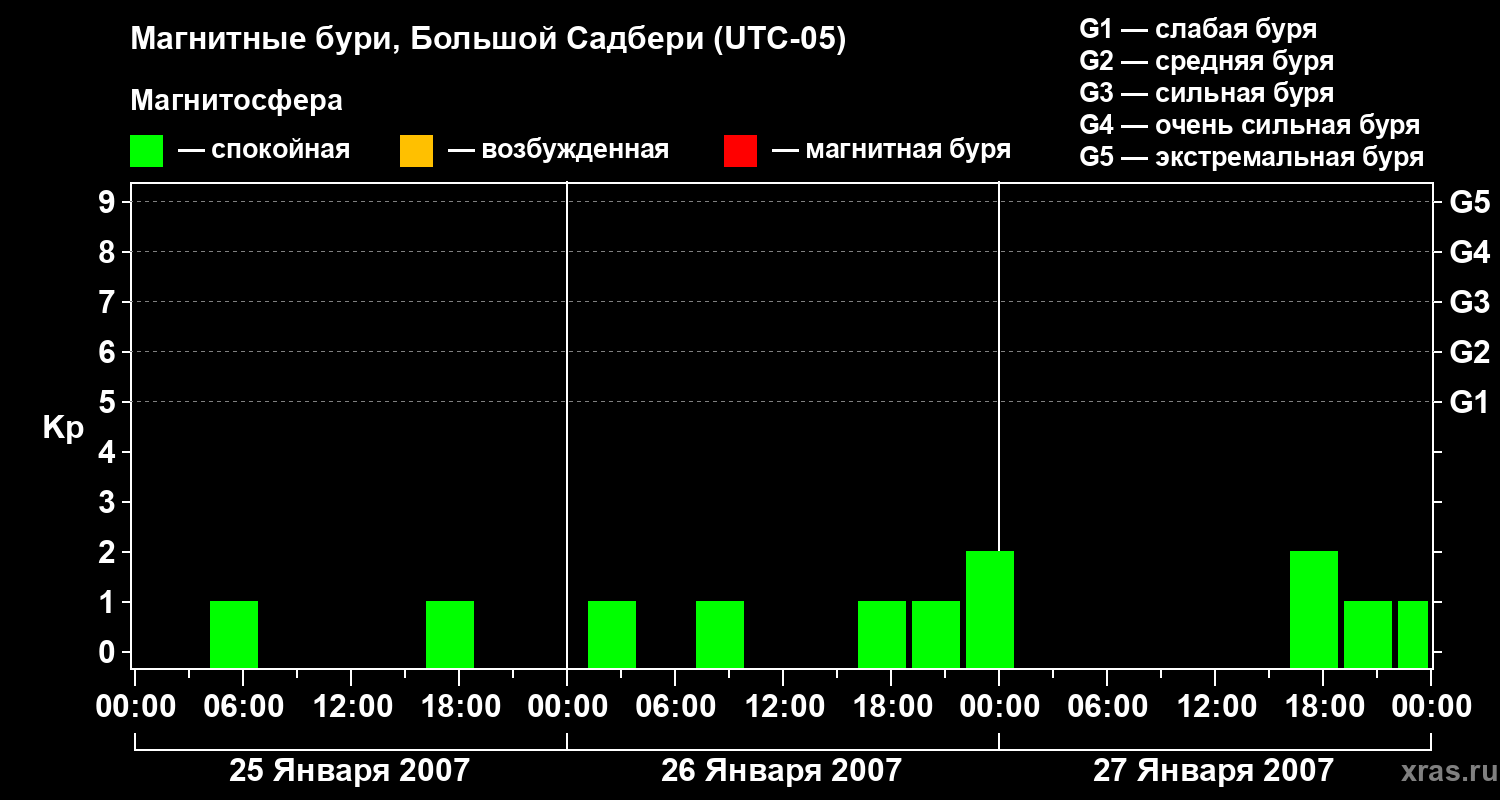 Изменения геомагнитного индекса Kp с 25 по 27 января 2007 года для средних широт