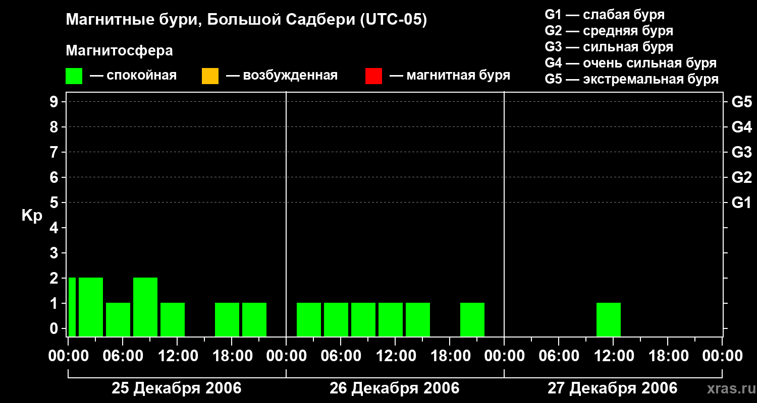 Изменения геомагнитного индекса Kp с 25 по 27 декабря 2006 года для средних широт