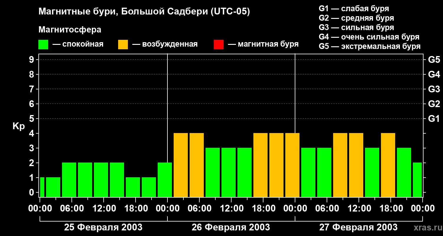 Изменения геомагнитного индекса Kp с 25 по 27 февраля 2003 года для средних широт