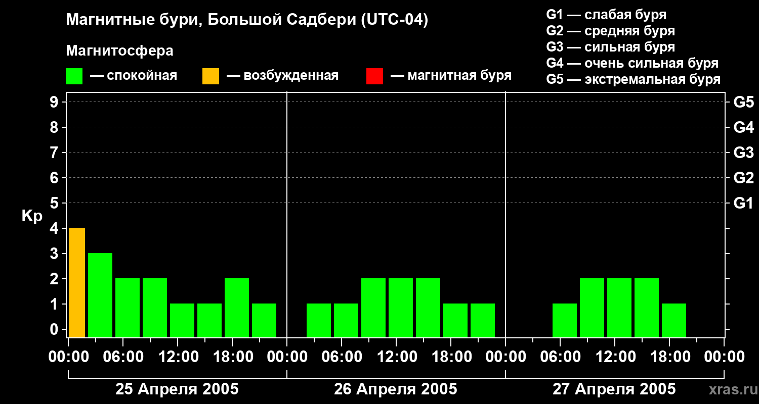 Изменения геомагнитного индекса Kp с 25 по 27 апреля 2005 года для средних широт