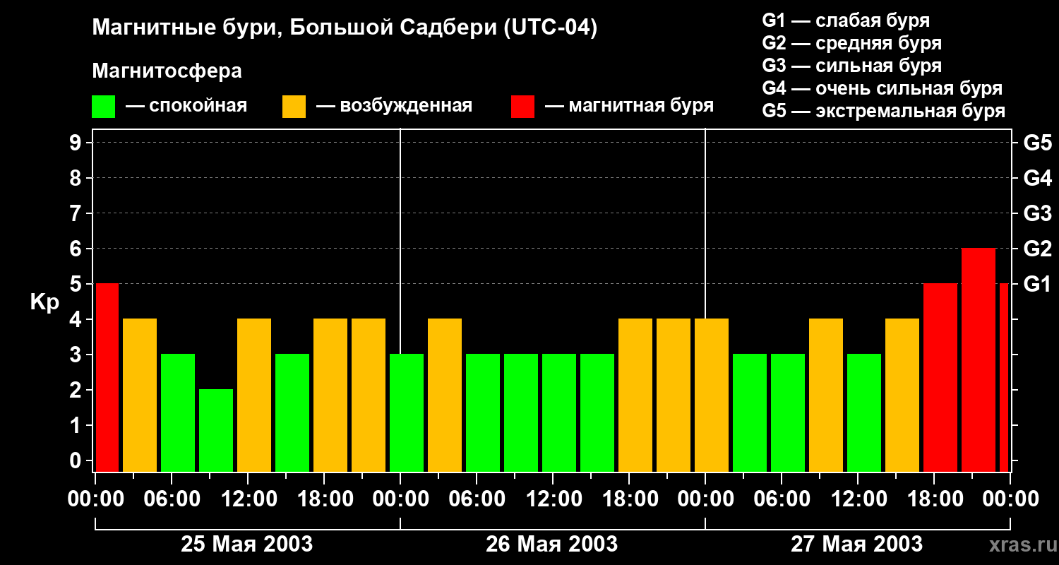 Изменения геомагнитного индекса Kp с 25 по 27 мая 2003 года для средних широт