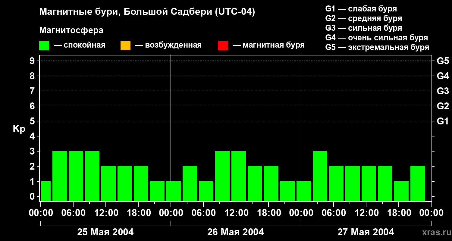 Изменения геомагнитного индекса Kp с 25 по 27 мая 2004 года для средних широт
