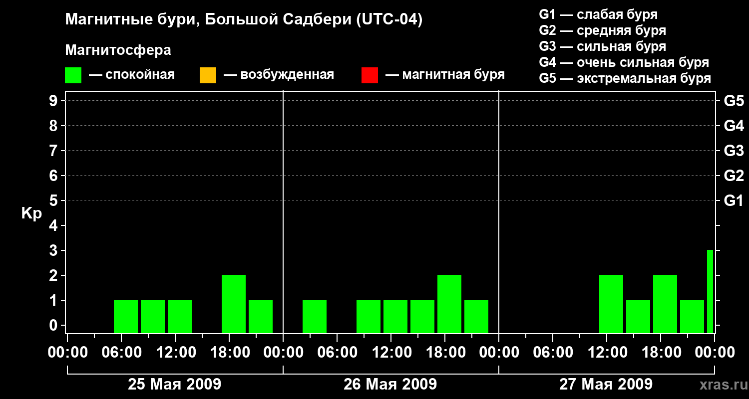 Изменения геомагнитного индекса Kp с 25 по 27 мая 2009 года для средних широт